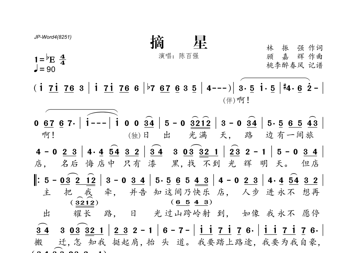 《摘星》是陈百强演唱的一首歌曲,拍号为4/4拍,歌曲速度为每分钟90拍,这份简谱共有一张高清图谱,图谱由 @桃李醉春风 编配上传。