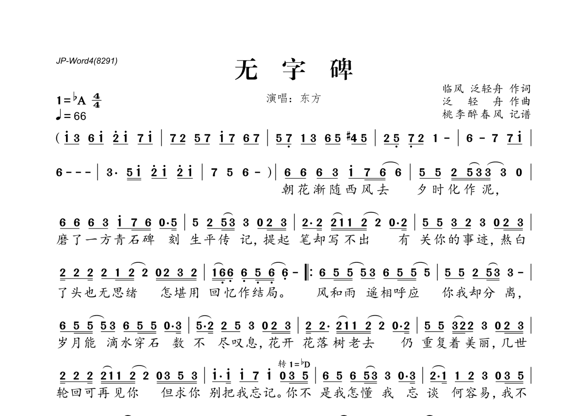 《无字碑》是东方演唱的一首歌曲,拍号为4/4拍,歌曲速度为每分钟66拍,这份简谱共有一张高清图谱,图谱由 @桃李醉春风 编配上传。