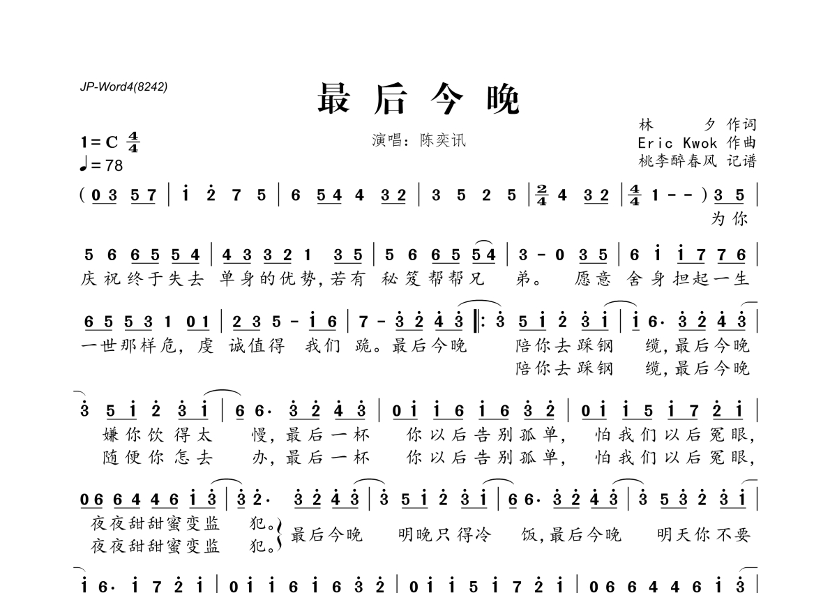 《最后今晚》是陈奕讯演唱的一首歌曲,拍号为4/4拍,歌曲速度为每分钟78拍,这份简谱共有一张高清图谱,图谱由 @桃李醉春风 编配上传。