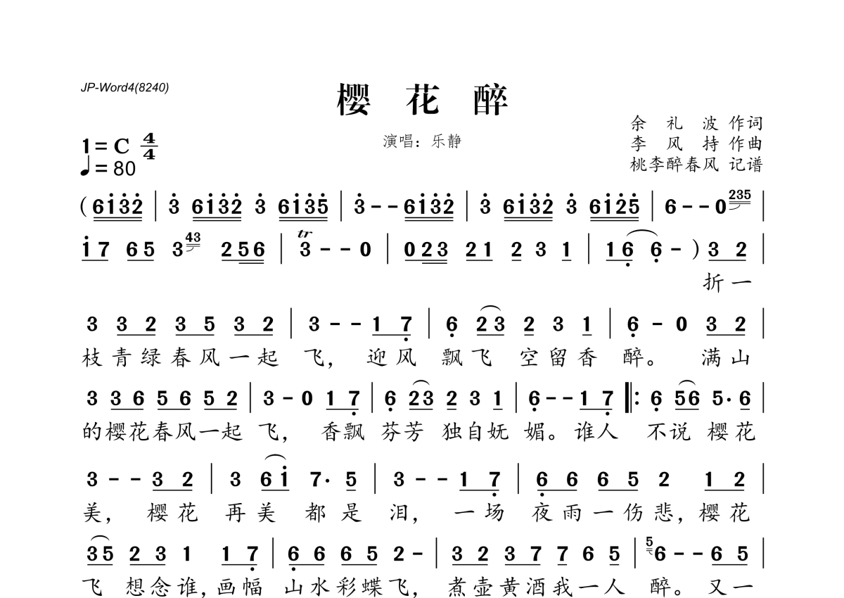 《樱花醉》是乐静演唱的一首歌曲,拍号为4/4拍,歌曲速度为每分钟80拍,这份简谱共有一张高清图谱,图谱由 @桃李醉春风 编配上传。