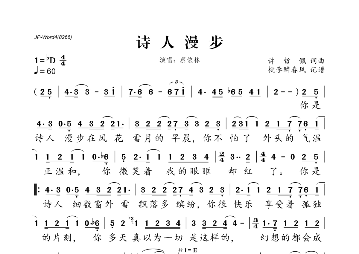 《诗人漫步》是蔡依林演唱的一首歌曲,拍号为4/4拍,歌曲速度为每分钟60拍,这份简谱共有一张高清图谱,图谱由 @桃李醉春风 编配上传。