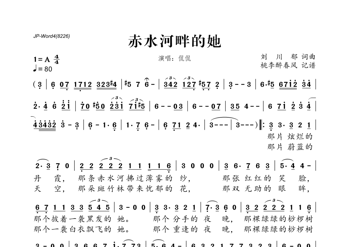 《赤水河畔的她》是侃侃演唱的一首歌曲,拍号为4/4拍,歌曲速度为每分钟80拍,这份简谱共有一张高清图谱,图谱由 @桃李醉春风 编配上传。