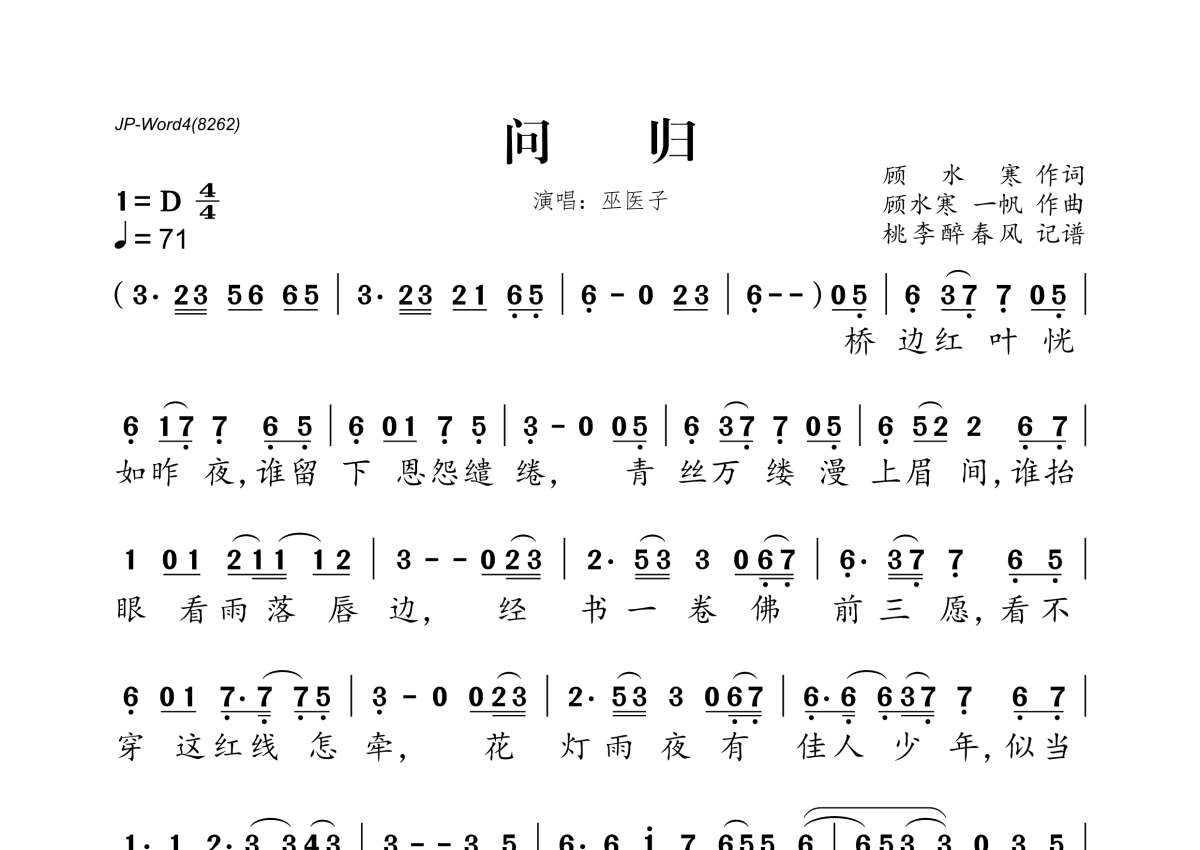 《问归》是巫医子演唱的一首歌曲,拍号为4/4拍,歌曲速度为每分钟71拍,这份简谱共有一张高清图谱,图谱由 @桃李醉春风 编配上传。