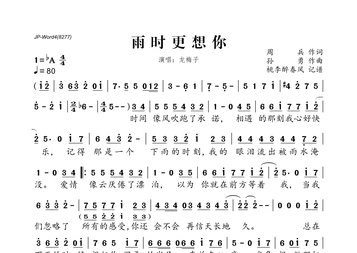 《雨时更想你》是龙梅子演唱的一首歌曲,拍号为4/4拍,歌曲速度为每分钟80拍,这份简谱共有一张高清图谱,图谱由 @桃李醉春风 编配上传。