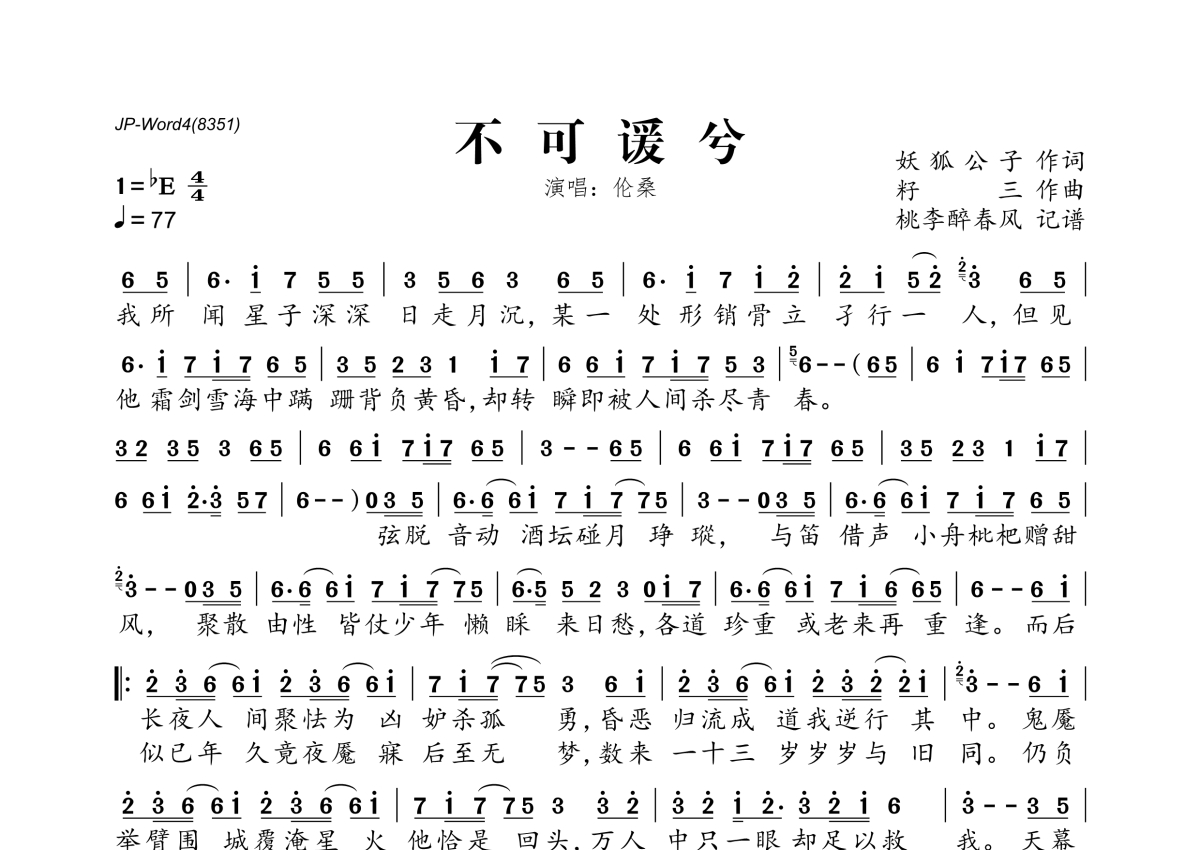 《不可谖兮》是伦桑演唱的一首歌曲,拍号为4/4拍,歌曲速度为每分钟77拍,这份简谱共有一张高清图谱,图谱由 @桃李醉春风 编配上传。