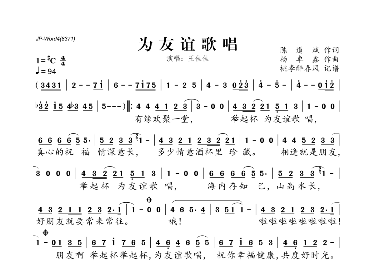 《为友谊歌唱》是王佳佳演唱的一首歌曲,拍号为4/4拍,歌曲速度为每分钟94拍,这份简谱共有一张高清图谱,图谱由 @桃李醉春风 编配上传。
