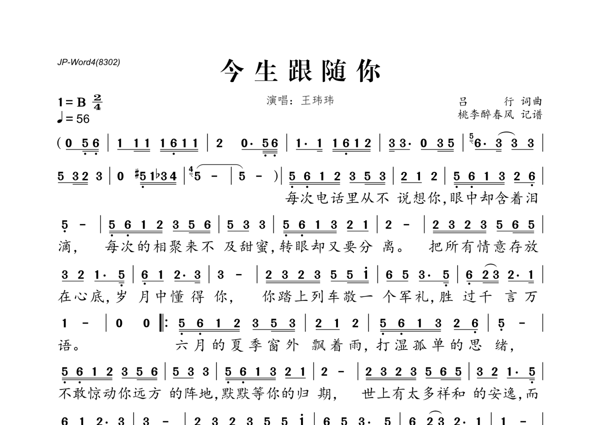 《今生跟随你》是王玮玮演唱的一首歌曲,拍号为2/4拍,歌曲速度为每分钟56拍,这份简谱共有一张高清图谱,图谱由 @桃李醉春风 编配上传。