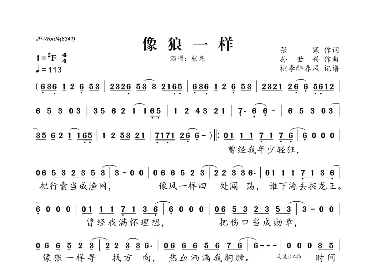 张寒《像狼一样》简谱