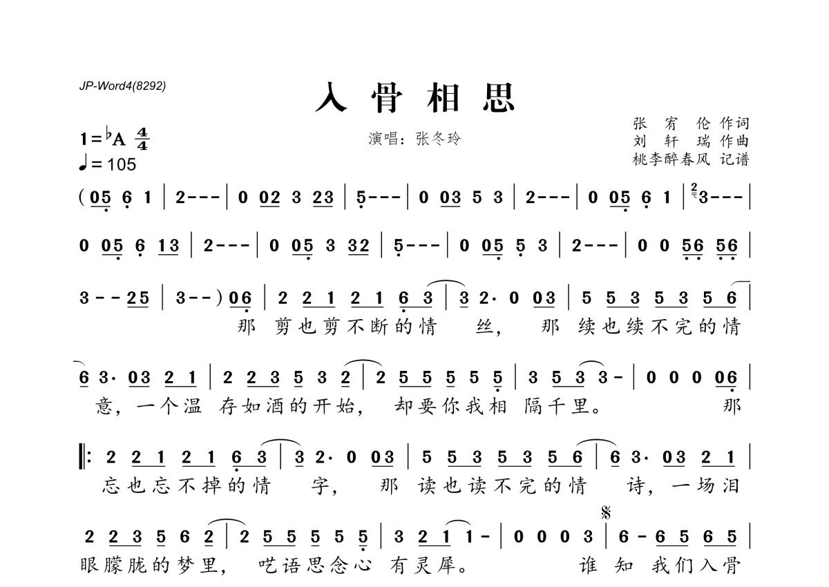 《入骨相思》是张冬玲演唱的一首歌曲,拍号为4/4拍,歌曲速度为每分钟105拍,这份简谱共有一张高清图谱,图谱由 @桃李醉春风 编配上传。