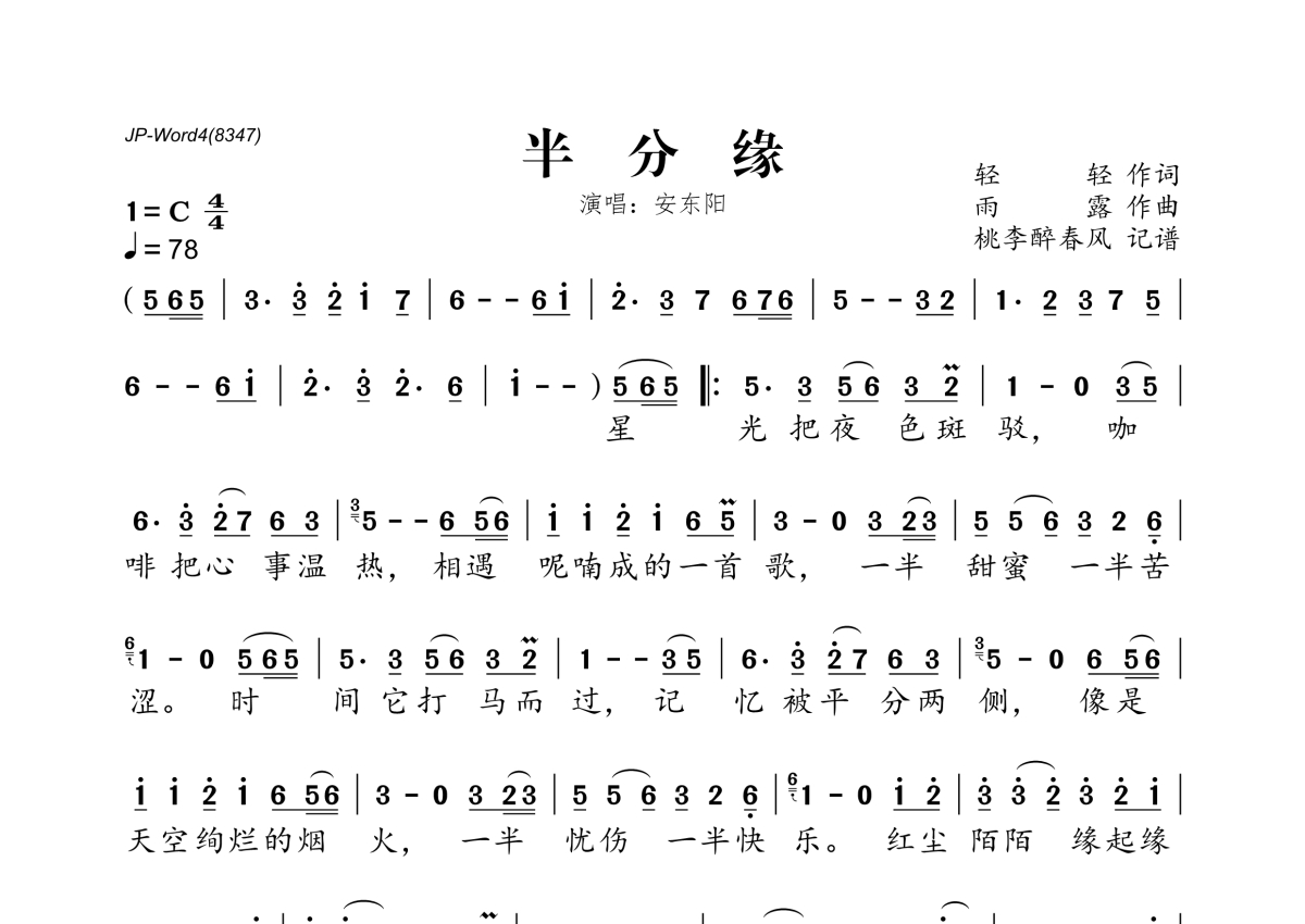 《半分缘》是安东阳演唱的一首歌曲,拍号为4/4拍,歌曲速度为每分钟78拍,这份简谱共有一张高清图谱,图谱由 @桃李醉春风 编配上传。