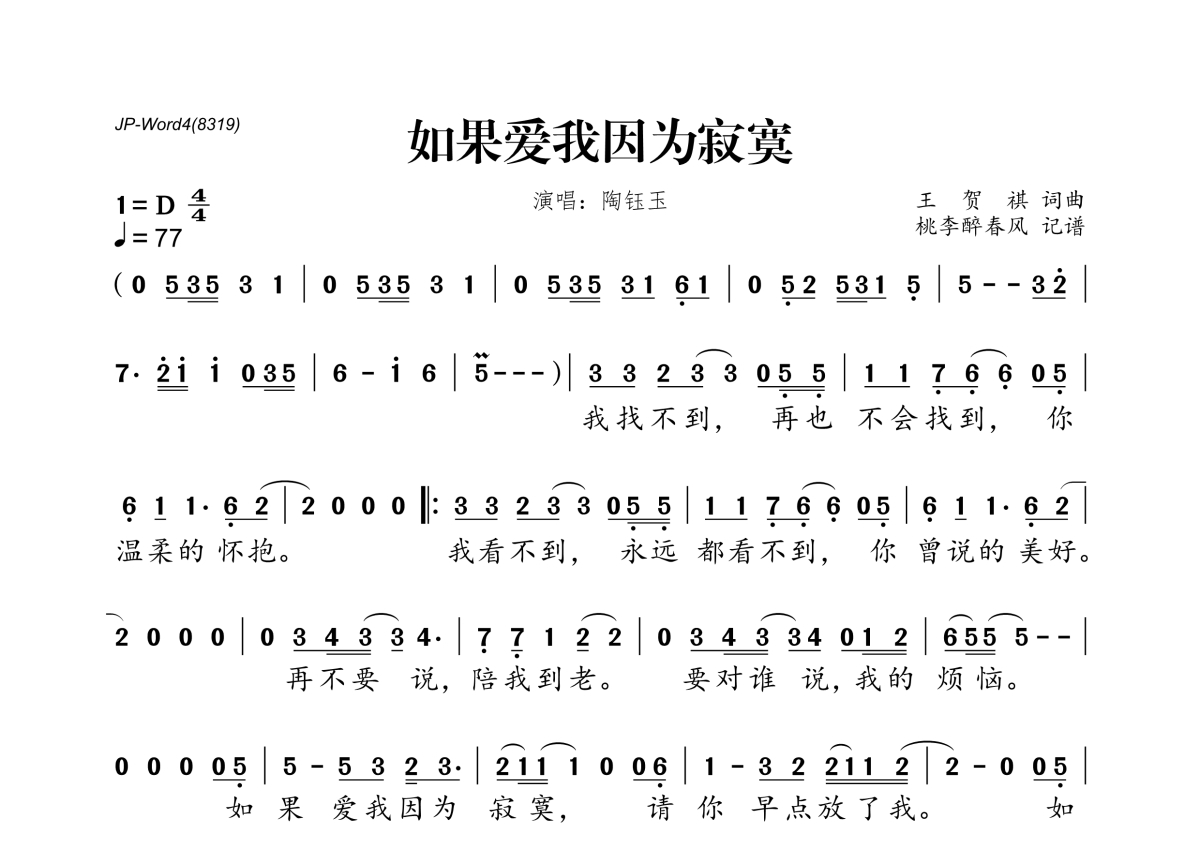 《如果爱我因为寂寞》是陶钰玉演唱的一首歌曲,拍号为4/4拍,歌曲速度为每分钟77拍,这份简谱共有一张高清图谱,图谱由 @桃李醉春风 编配上传。