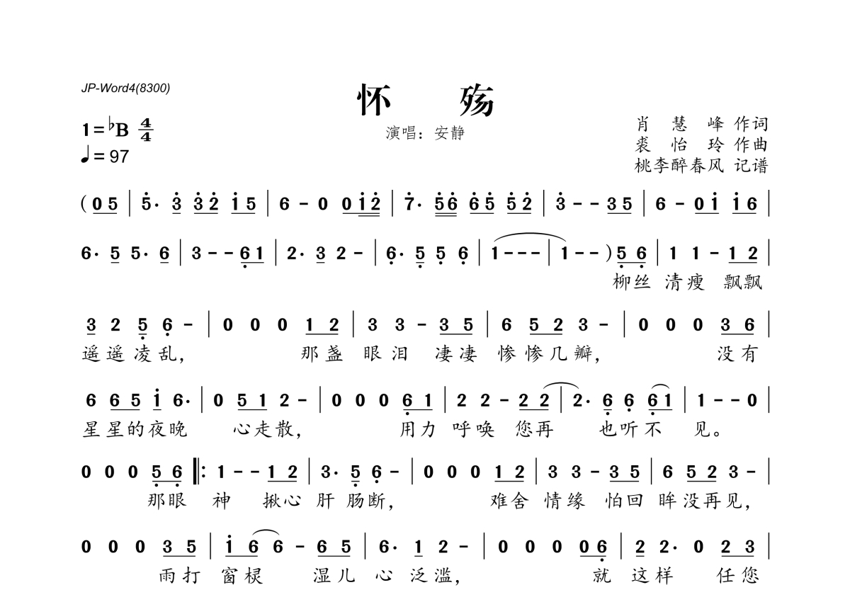 《怀殇》是安静演唱的一首歌曲,拍号为4/4拍,歌曲速度为每分钟97拍,这份简谱共有一张高清图谱,图谱由 @桃李醉春风 编配上传。