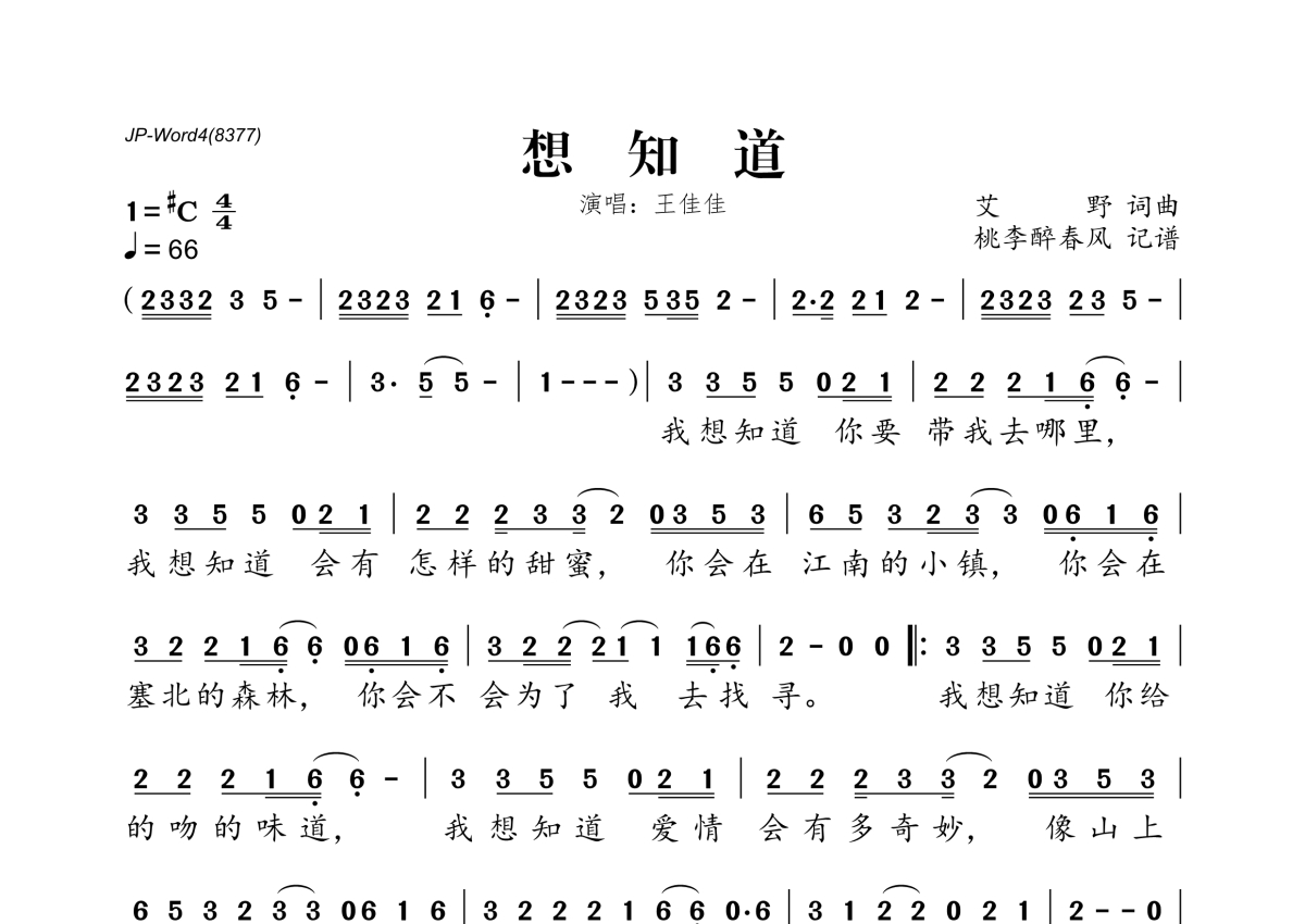 《想知道》是王佳佳演唱的一首歌曲,拍号为4/4拍,歌曲速度为每分钟66拍,这份简谱共有一张高清图谱,图谱由 @桃李醉春风 编配上传。
