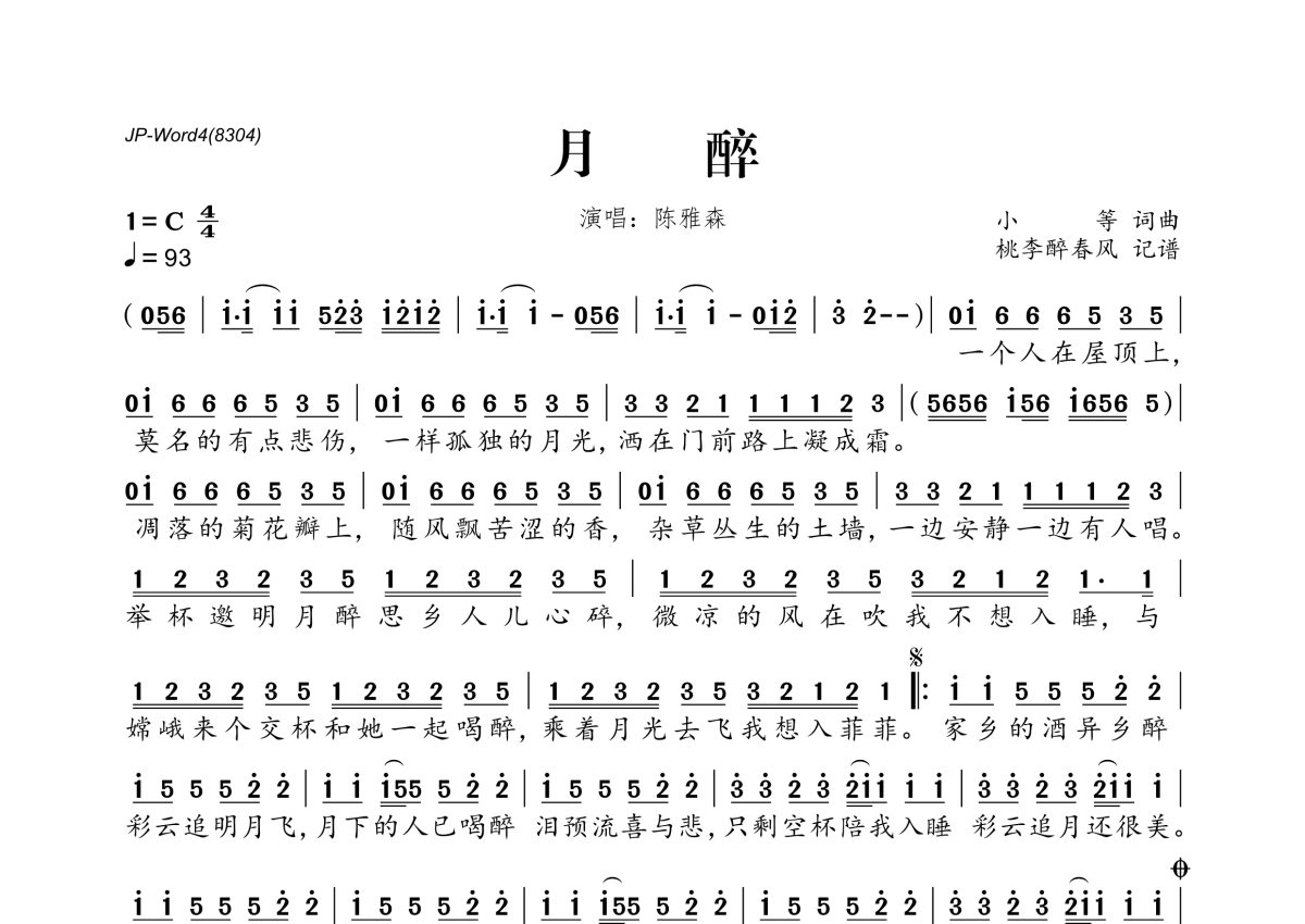 《月醉》是陈雅森演唱的一首歌曲,拍号为4/4拍,歌曲速度为每分钟93拍,这份简谱共有一张高清图谱,图谱由 @桃李醉春风 编配上传。
