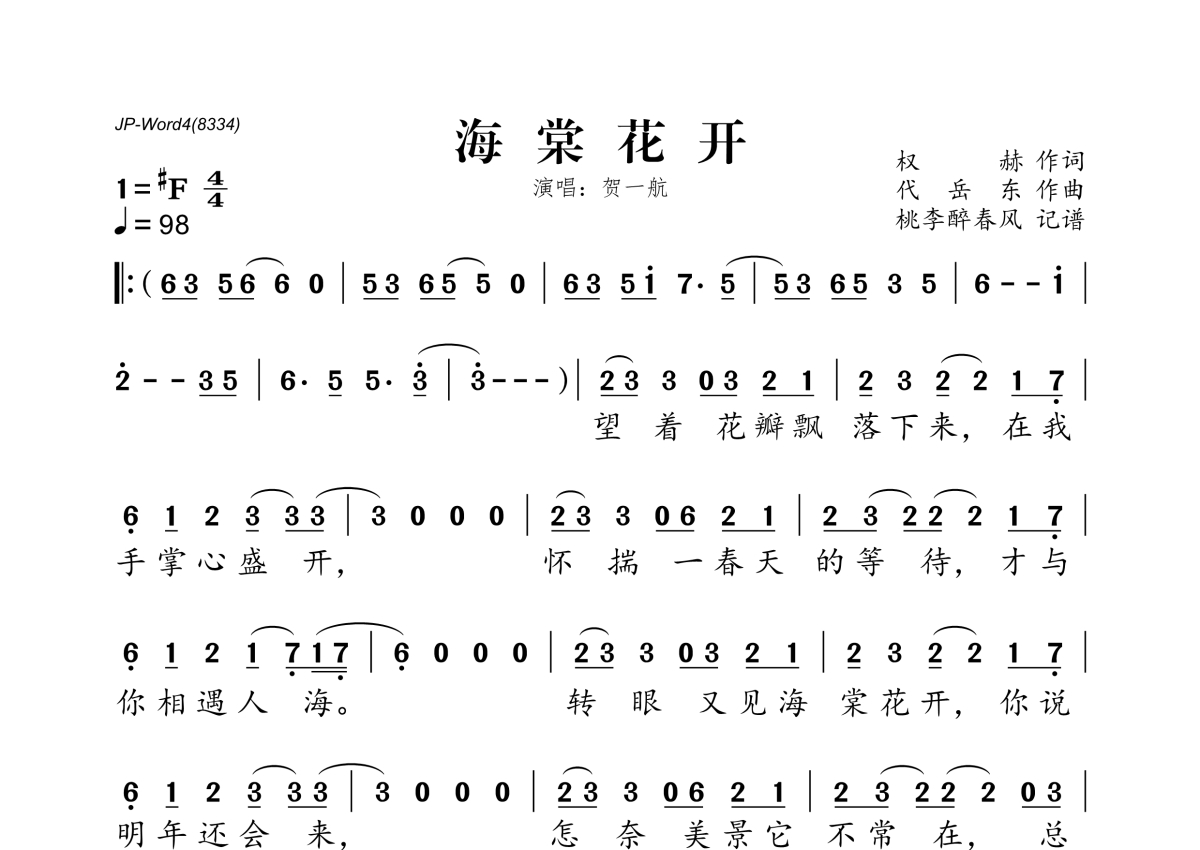 《海棠花开》是贺一航演唱的一首歌曲,拍号为4/4拍,歌曲速度为每分钟98拍,这份简谱共有一张高清图谱,图谱由 @桃李醉春风 编配上传。
