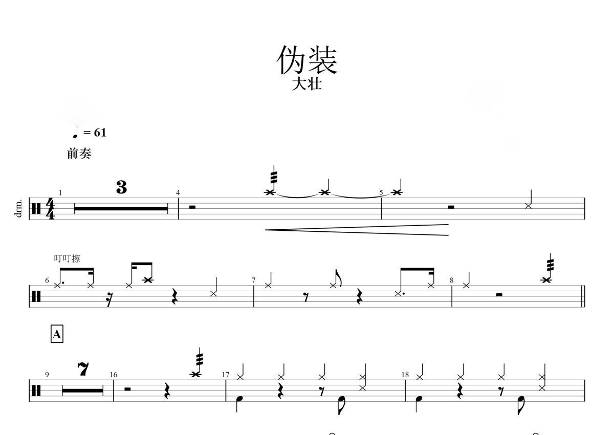 《伪装》是大壮演唱的一首歌曲,这份鼓谱共有三张高清图谱,图谱由 @打鼓谱 编配上传,图谱使用五线谱编配,使用这份伪装架子鼓谱,你将能够轻松地敲打出这首大壮的伪装,快来尝试吧。《伪装》是由大壮演唱的一首歌曲,大壮/一博填词作曲。发行于2019-02-28。
