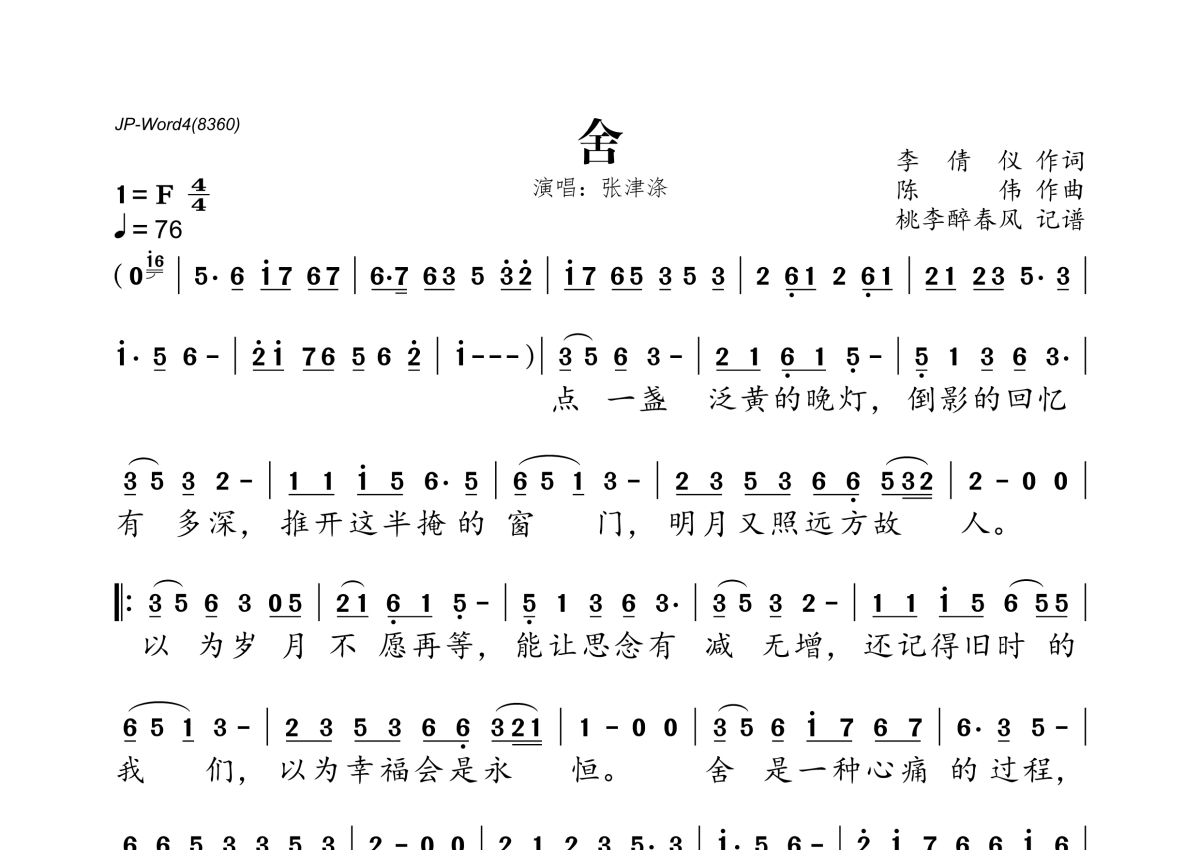 《舍》是张津涤演唱的一首歌曲,拍号为4/4拍,歌曲速度为每分钟76拍,这份简谱共有一张高清图谱,图谱由 @桃李醉春风 编配上传。