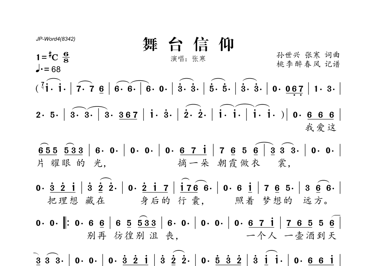 《舞台信仰》是张寒演唱的一首歌曲,拍号为6/8拍,歌曲速度为每分钟68拍,这份简谱共有一张高清图谱,图谱由 @桃李醉春风 编配上传。