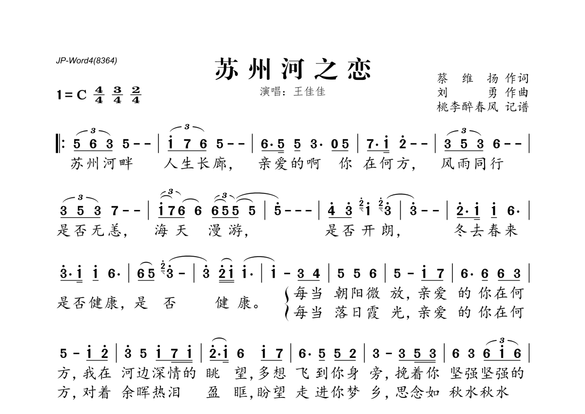 《苏州河之恋》是王佳佳演唱的一首歌曲,拍号为4/4拍,这份简谱共有一张高清图谱,图谱由 @桃李醉春风 编配上传。