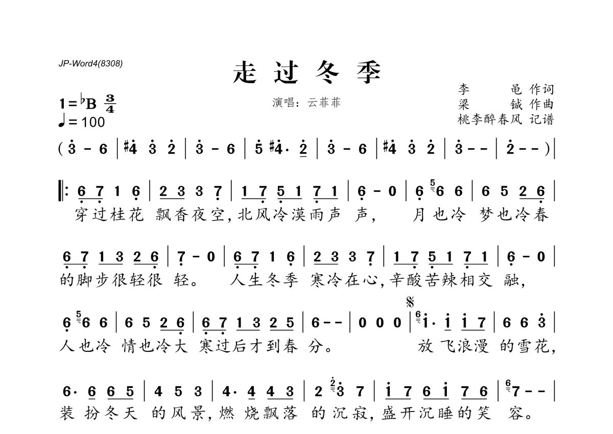《走过冬季》是云菲菲演唱的一首歌曲,拍号为3/4拍,歌曲速度为每分钟100拍,这份简谱共有一张高清图谱,图谱由 @桃李醉春风 编配上传。