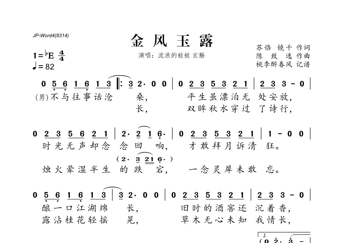 《金风玉露》是流浪的蛙蛙&玄觞演唱的一首歌曲,拍号为4/4拍,歌曲速度为每分钟82拍,这份简谱共有两张高清图谱,图谱由 @桃李醉春风 编配上传。