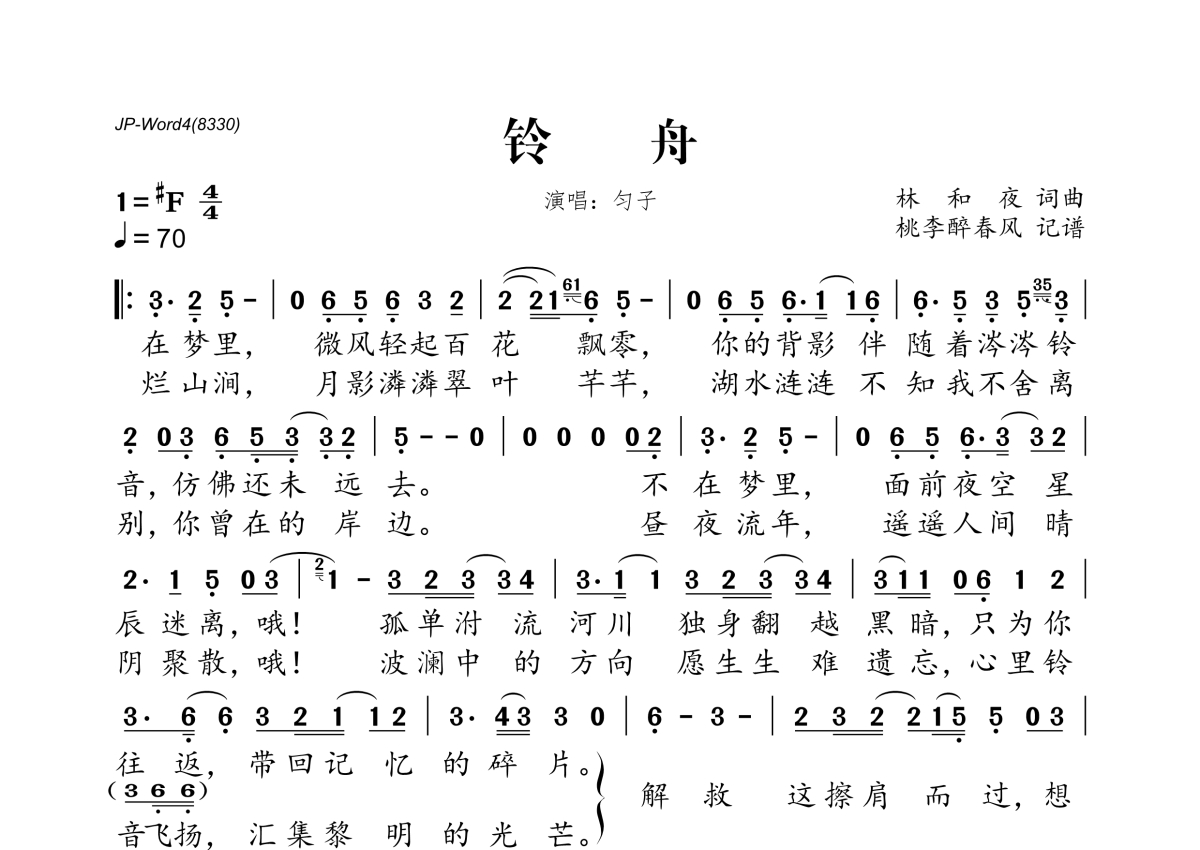 《铃舟》是匀子演唱的一首歌曲,拍号为4/4拍,歌曲速度为每分钟70拍,这份简谱共有一张高清图谱,图谱由 @桃李醉春风 编配上传。