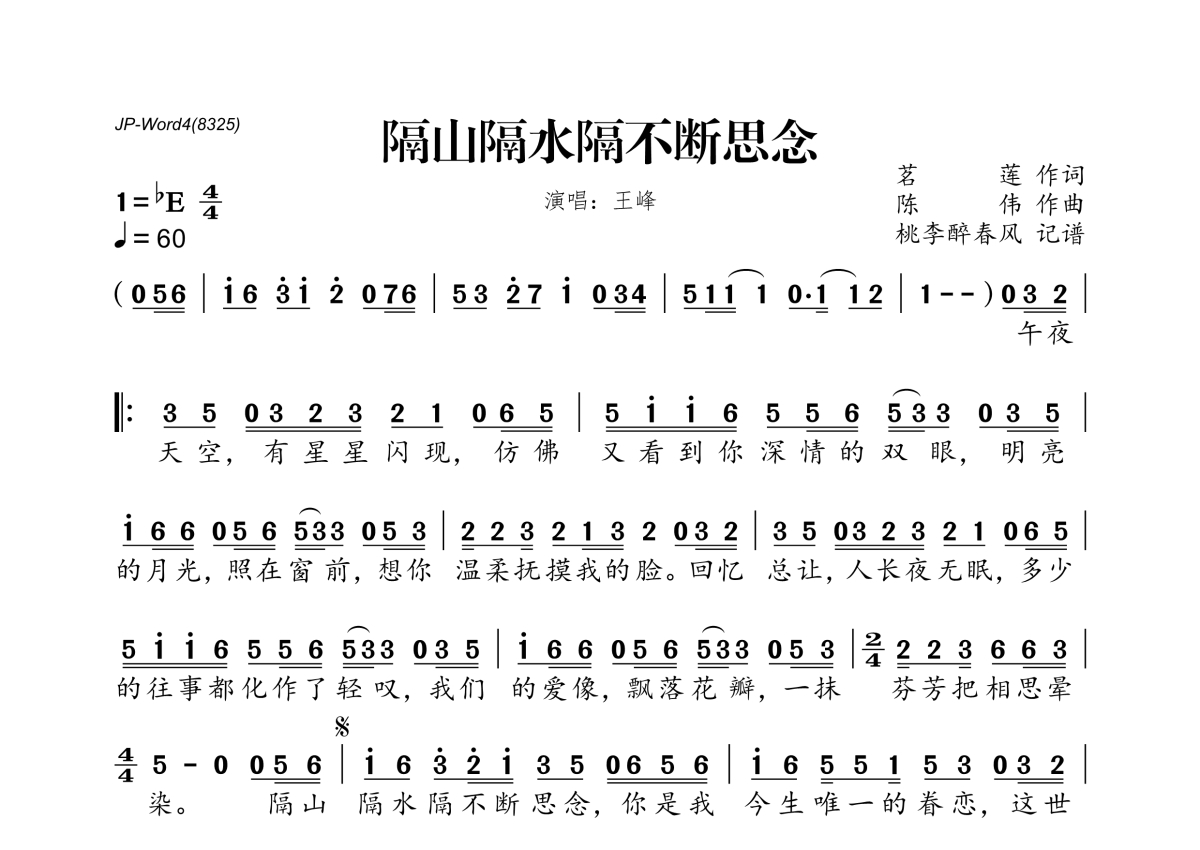 《隔山隔水隔不断思念》是王峰演唱的一首歌曲,拍号为4/4拍,歌曲速度为每分钟60拍,这份简谱共有一张高清图谱,图谱由 @桃李醉春风 编配上传。