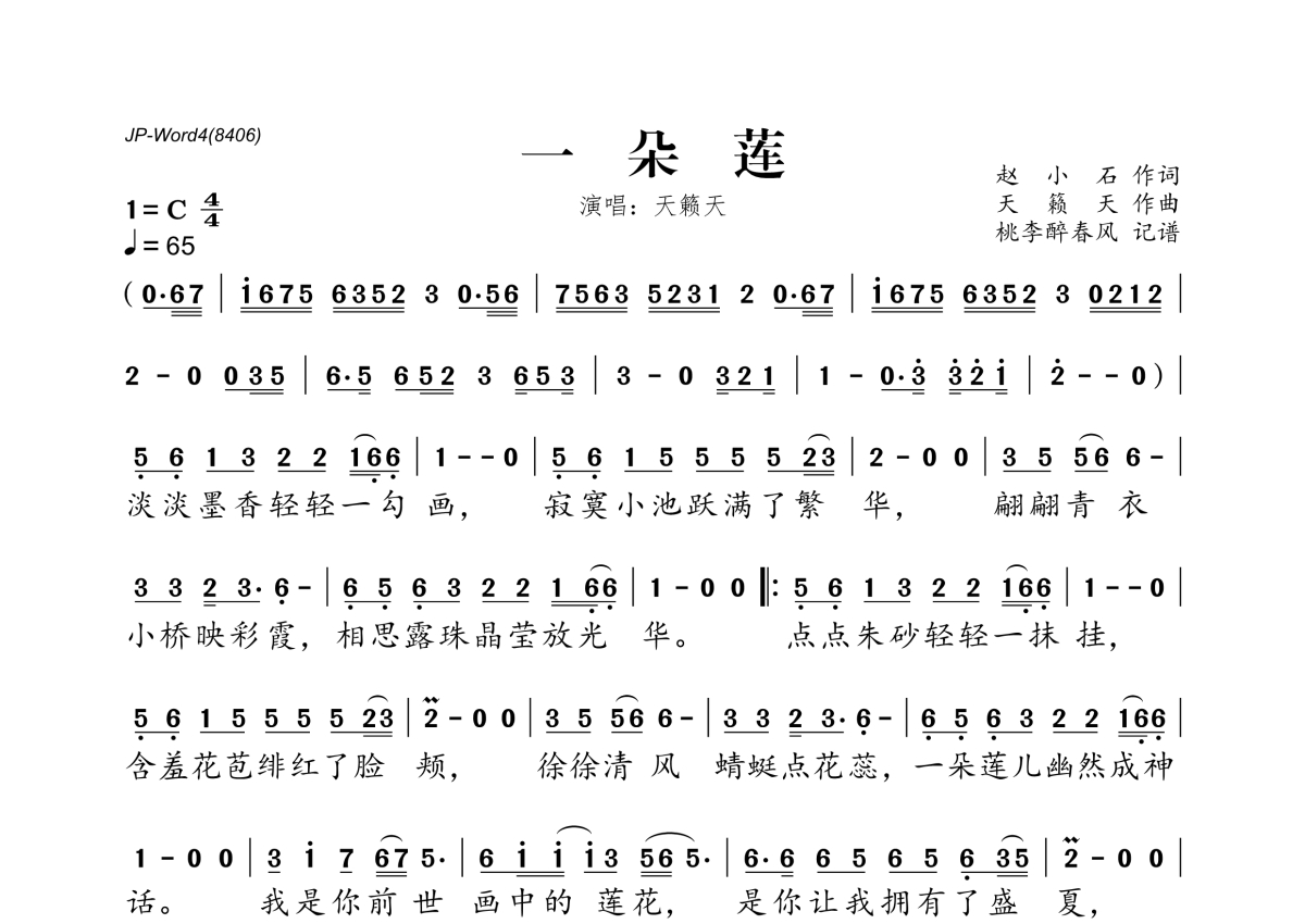 《一朵莲》是天籁天演唱的一首歌曲,拍号为4/4拍,歌曲速度为每分钟65拍,这份简谱共有一张高清图谱,图谱由 @桃李醉春风 编配上传。