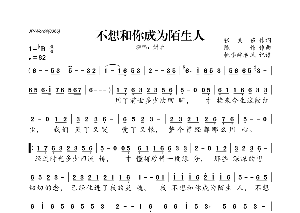《不想和你成为陌生人》是娟子演唱的一首歌曲,拍号为4/4拍,歌曲速度为每分钟82拍,这份简谱共有一张高清图谱,图谱由 @桃李醉春风 编配上传。