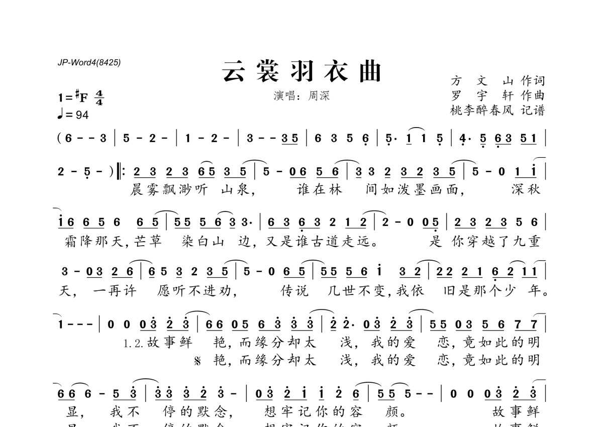 《云裳羽衣曲》是周深演唱的一首歌曲,拍号为4/4拍,歌曲速度为每分钟94拍,这份简谱共有一张高清图谱,图谱由 @桃李醉春风 编配上传。