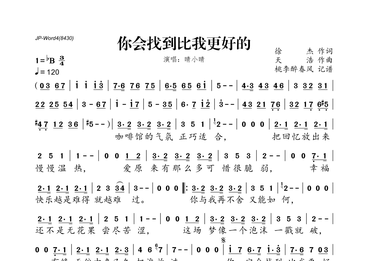 《你会找到比我更好的》是晴小晴演唱的一首歌曲,拍号为3/4拍,歌曲速度为每分钟120拍,这份简谱共有一张高清图谱,图谱由 @桃李醉春风 编配上传。