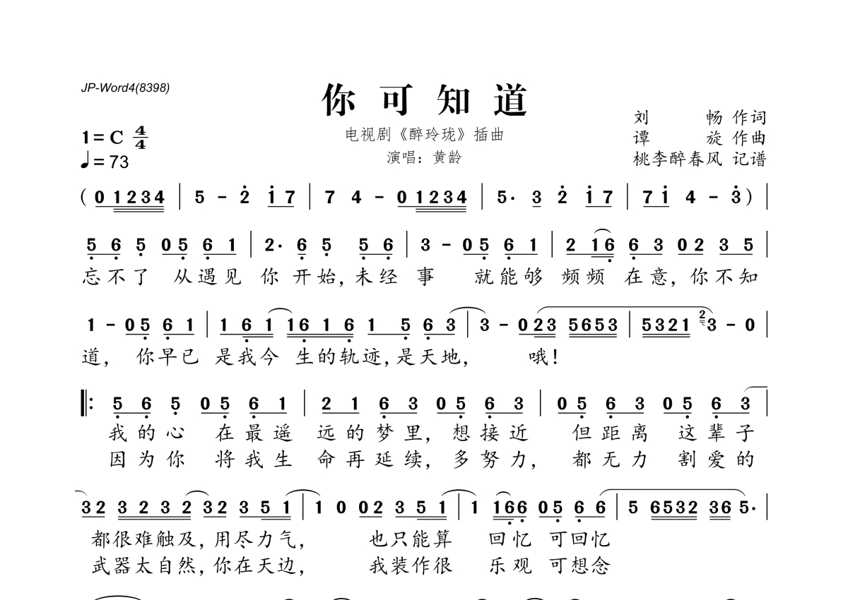 《你可知道》是黄龄演唱的一首歌曲,拍号为4/4拍,歌曲速度为每分钟73拍,这份简谱共有一张高清图谱,图谱由 @桃李醉春风 编配上传。