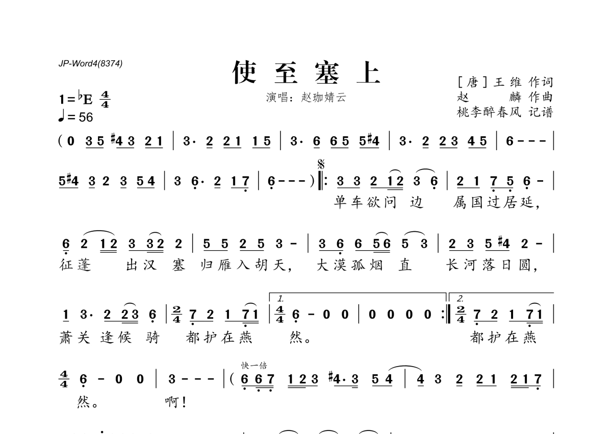 《使至塞上》是赵珈婧云演唱的一首歌曲,拍号为4/4拍,歌曲速度为每分钟56拍,这份简谱共有一张高清图谱,图谱由 @桃李醉春风 编配上传。