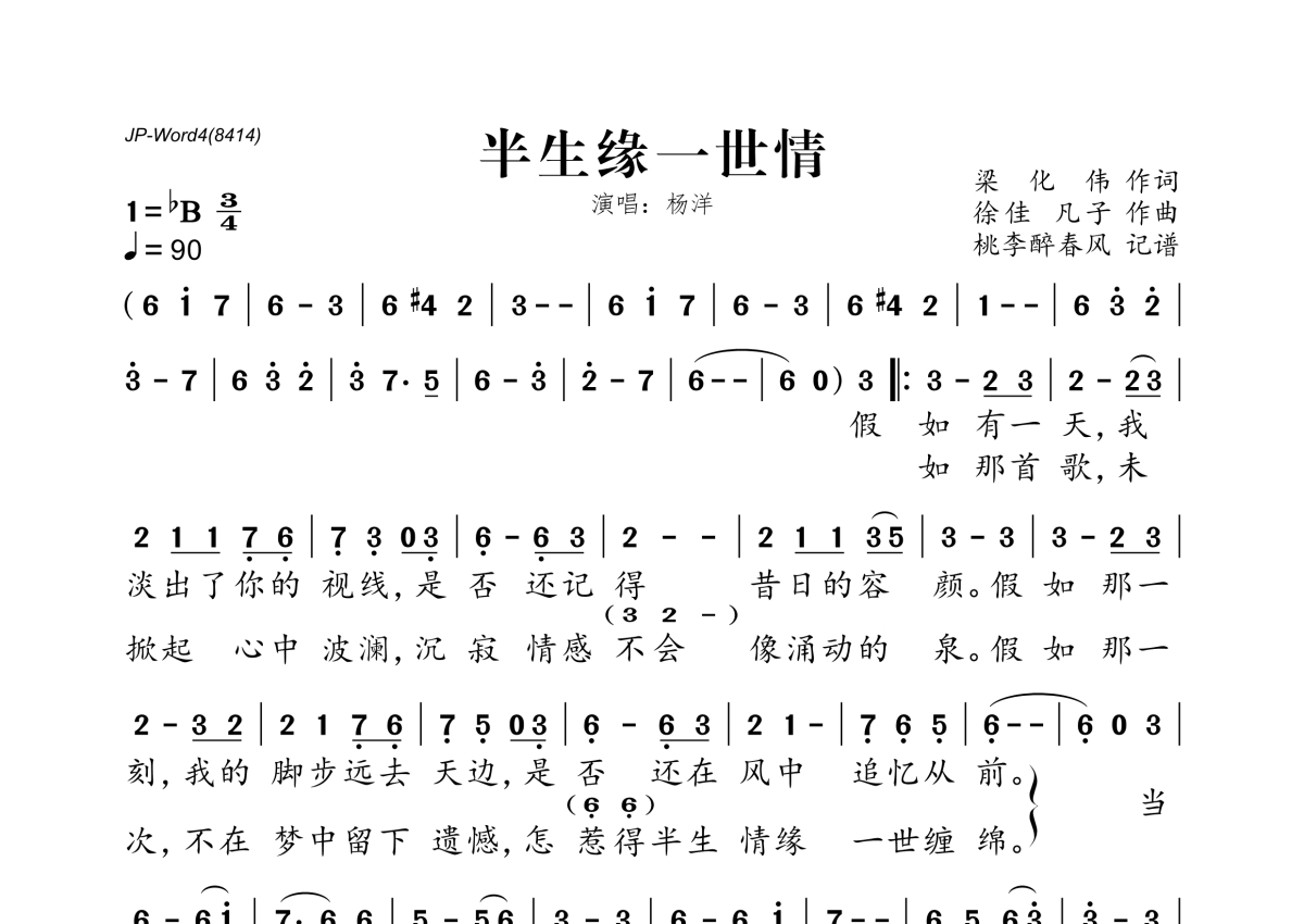 《半生缘一世情》是杨洋演唱的一首歌曲,拍号为3/4拍,歌曲速度为每分钟90拍,这份简谱共有一张高清图谱,图谱由 @桃李醉春风 编配上传。