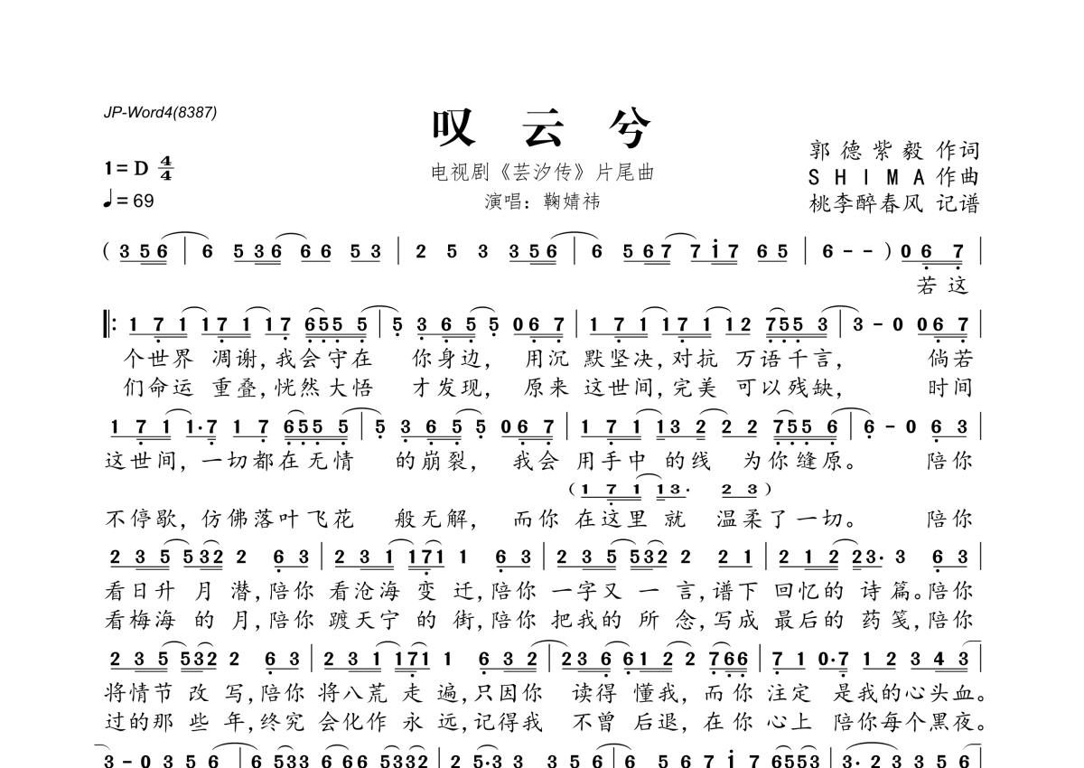 《叹云兮》是鞠婧袆演唱的一首歌曲,拍号为4/4拍,歌曲速度为每分钟69拍,这份简谱共有一张高清图谱,图谱由 @桃李醉春风 编配上传。