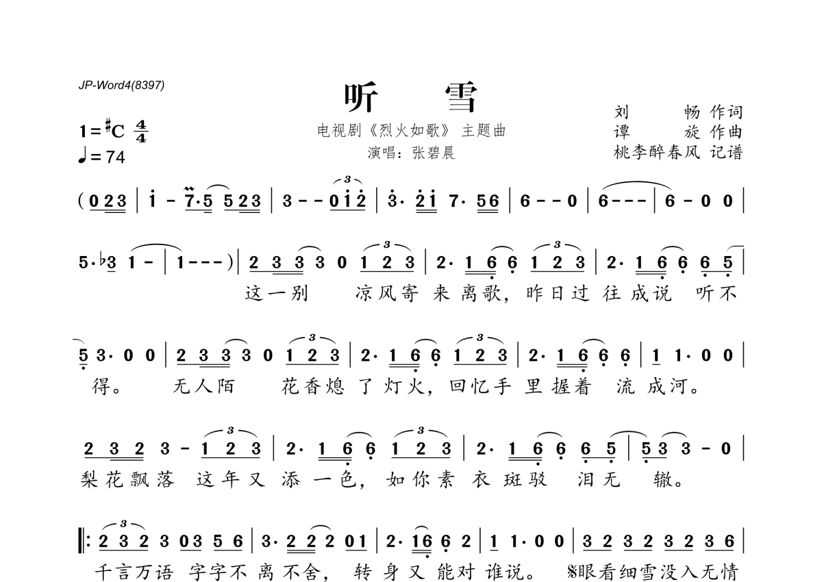 《听雪》是佚名演唱的一首歌曲,拍号为4/4拍,歌曲速度为每分钟74拍,这份简谱共有一张高清图谱,图谱由 @桃李醉春风 编配上传。