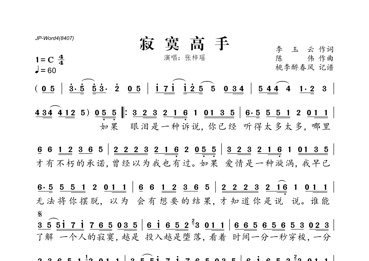 《寂寞高手》是张梓瑶演唱的一首歌曲,拍号为4/4拍,歌曲速度为每分钟60拍,这份简谱共有一张高清图谱,图谱由 @桃李醉春风 编配上传。