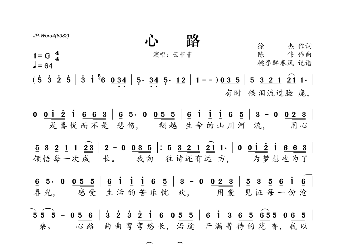 《心路》是云菲菲演唱的一首歌曲,拍号为4/4拍,歌曲速度为每分钟64拍,这份简谱共有一张高清图谱,图谱由 @桃李醉春风 编配上传。