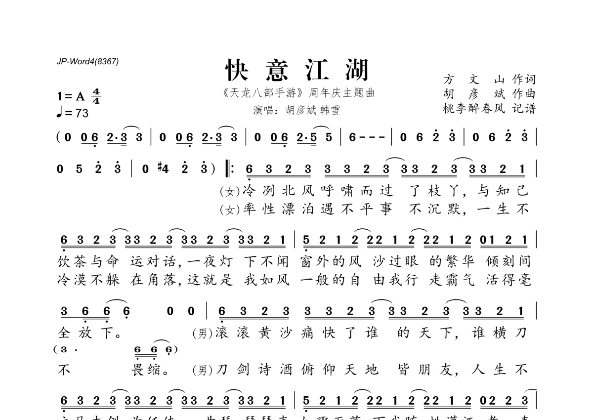 《快意江湖》是胡彦斌&韩雪演唱的一首歌曲,拍号为4/4拍,歌曲速度为每分钟73拍,这份简谱共有两张高清图谱,图谱由 @桃李醉春风 编配上传。