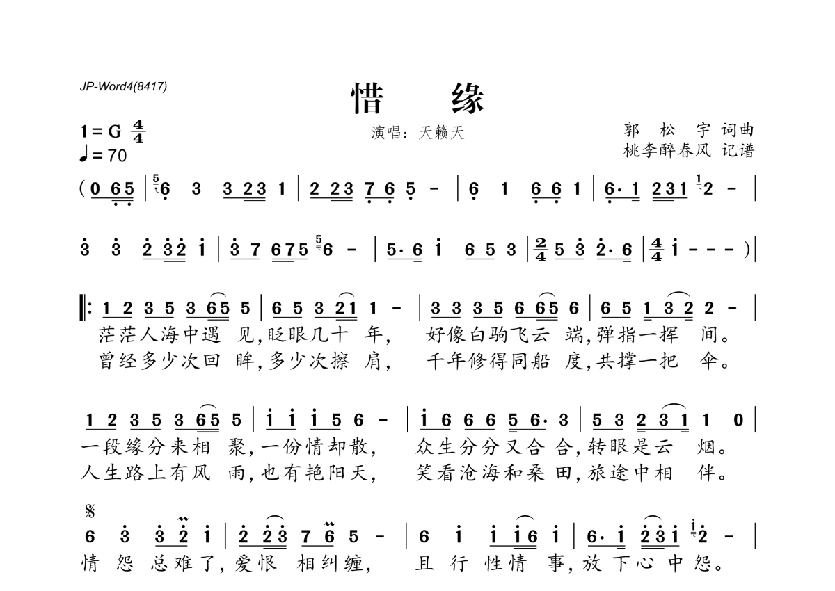 《惜缘》是天籁天演唱的一首歌曲,拍号为4/4拍,歌曲速度为每分钟70拍,这份简谱共有一张高清图谱,图谱由 @桃李醉春风 编配上传。