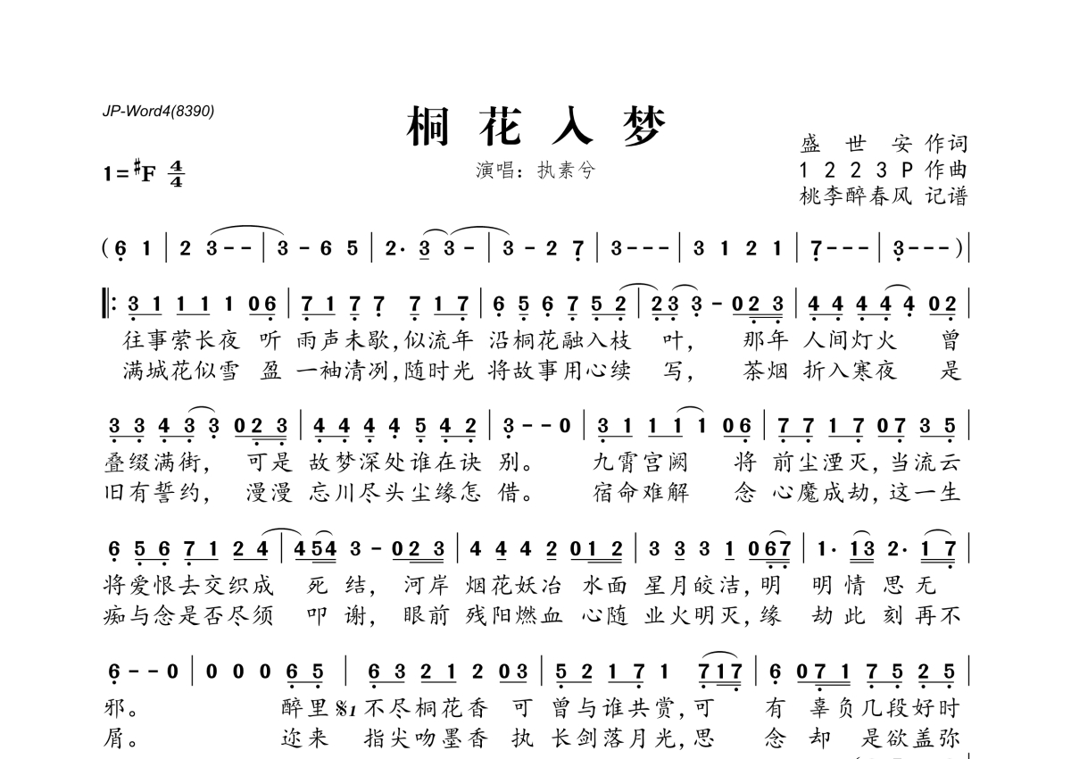 《桐花入梦》是执素兮演唱的一首歌曲,拍号为4/4拍,这份简谱共有一张高清图谱,图谱由 @桃李醉春风 编配上传。