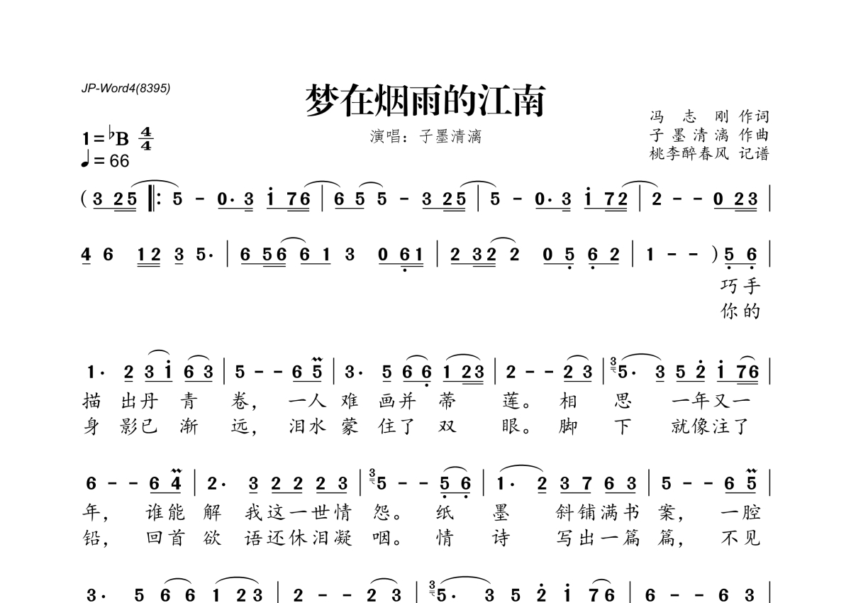 《梦在烟雨的江南》是子墨清漓演唱的一首歌曲,拍号为4/4拍,歌曲速度为每分钟66拍,这份简谱共有一张高清图谱,图谱由 @桃李醉春风 编配上传。