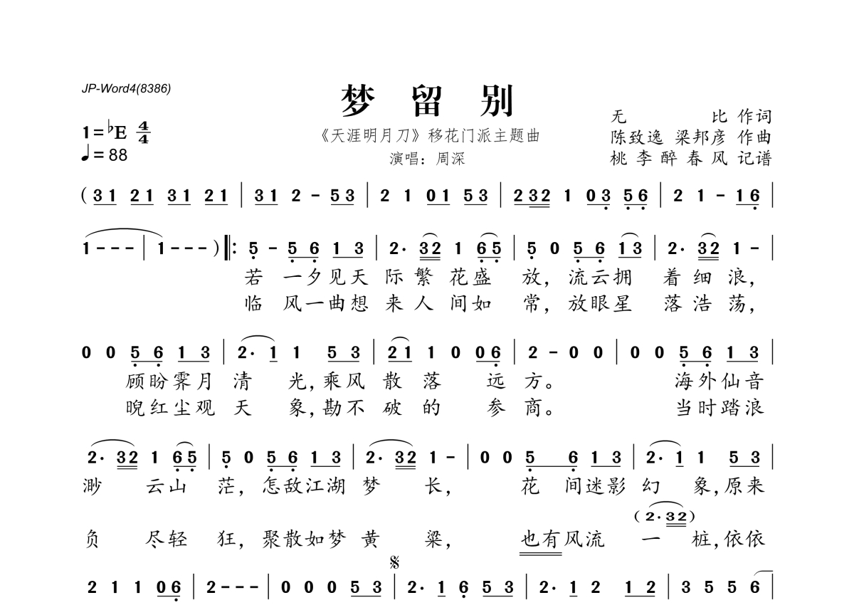 《梦留别》是周深演唱的一首歌曲,拍号为4/4拍,歌曲速度为每分钟88拍,这份简谱共有一张高清图谱,图谱由 @桃李醉春风 编配上传。