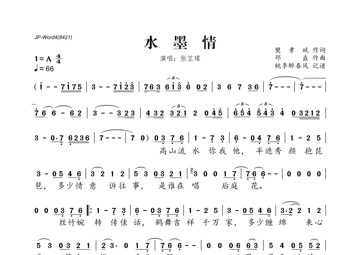 《水墨情》是张芷瑈演唱的一首歌曲,拍号为4/4拍,歌曲速度为每分钟66拍,这份简谱共有一张高清图谱,图谱由 @桃李醉春风 编配上传。