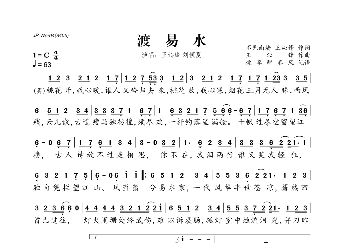 《渡易水》是王沁锋&刘倾夏演唱的一首歌曲,拍号为4/4拍,歌曲速度为每分钟63拍,这份简谱共有一张高清图谱,图谱由 @桃李醉春风 编配上传。