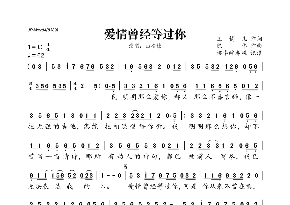 《爱情曾经等过你》是山楂妹演唱的一首歌曲,拍号为4/4拍,歌曲速度为每分钟62拍,这份简谱共有一张高清图谱,图谱由 @桃李醉春风 编配上传。