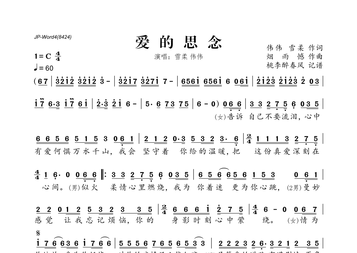 《爱的思念》是雪柔&伟伟演唱的一首歌曲,拍号为4/4拍,歌曲速度为每分钟60拍,这份简谱共有一张高清图谱,图谱由 @桃李醉春风 编配上传。