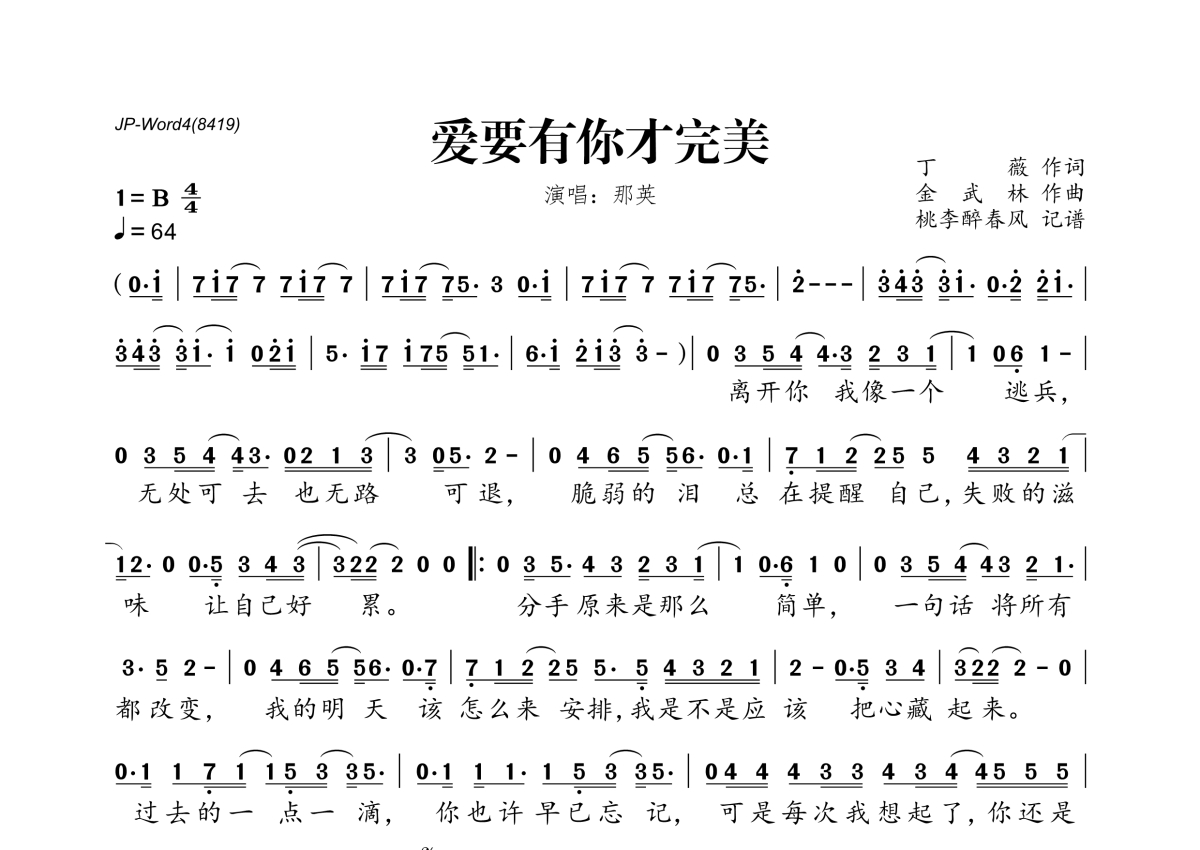 《爱要有你才完美》是那英演唱的一首歌曲,拍号为4/4拍,歌曲速度为每分钟64拍,这份简谱共有一张高清图谱,图谱由 @桃李醉春风 编配上传。