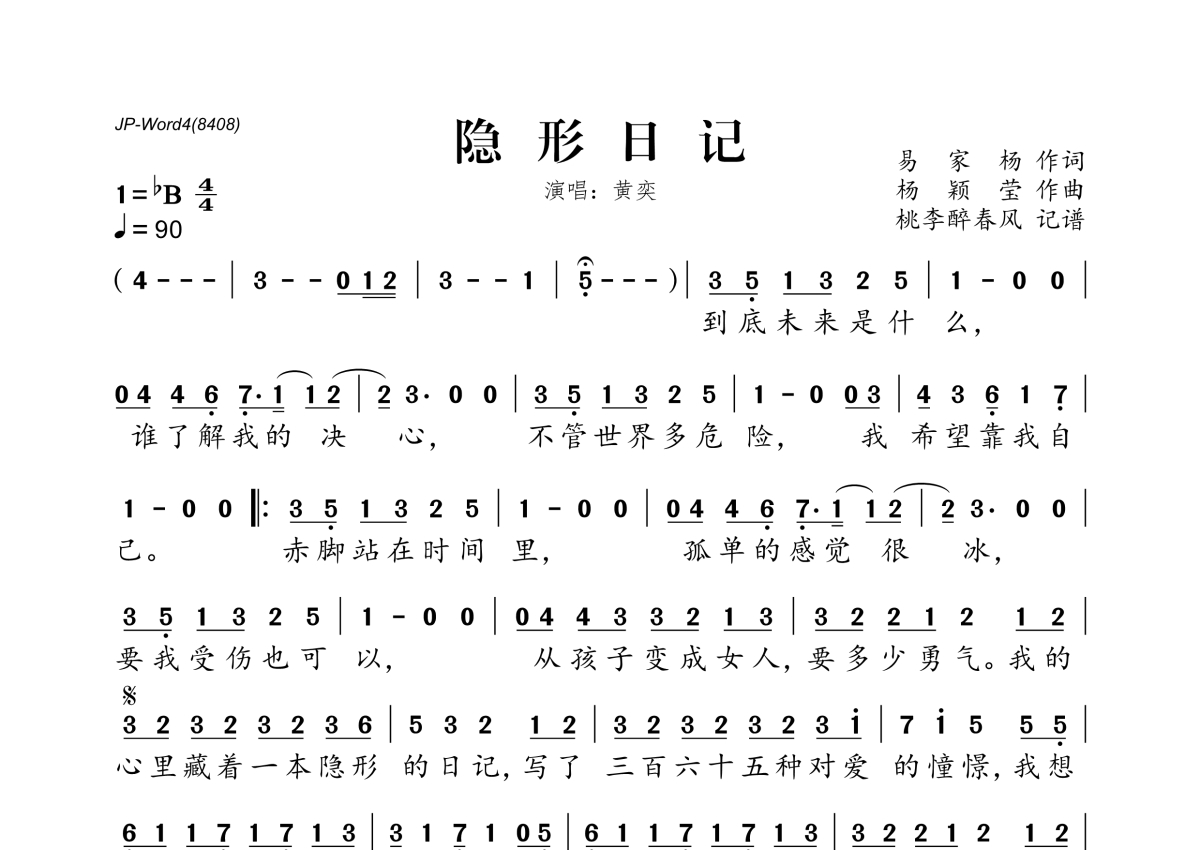 《隐形日记》是黄奕演唱的一首歌曲,拍号为4/4拍,歌曲速度为每分钟90拍,这份简谱共有一张高清图谱,图谱由 @桃李醉春风 编配上传。