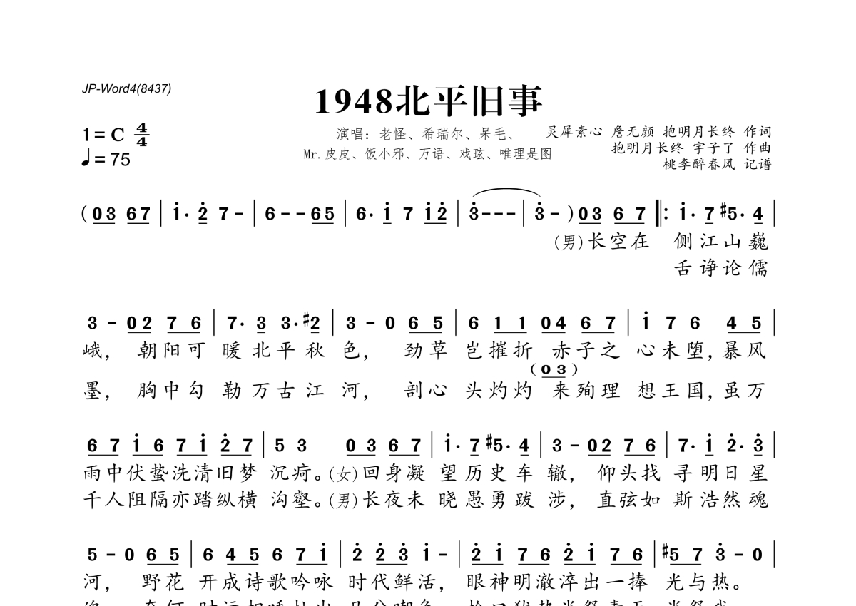 《1948北平旧事》是老怪、希瑞尔、呆毛演唱的一首歌曲,拍号为4/4拍,歌曲速度为每分钟75拍,这份简谱共有两张高清图谱,图谱由 @桃李醉春风 编配上传。